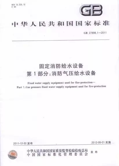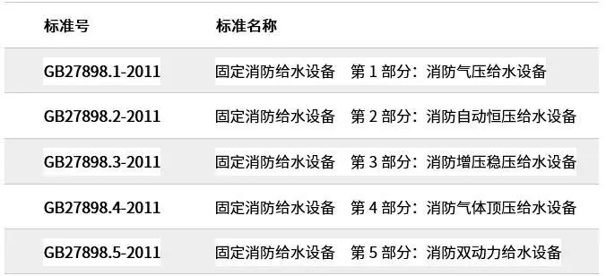 在2011年12月30日,國家又頒布了《GB27898:固定消防給水設(shè)備》;該標(biāo)準(zhǔn)作為GA30.2的升級標(biāo)準(zhǔn),一共分為5個部分,(見下表):
